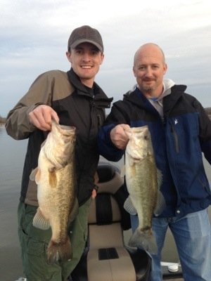 Our best bait has been a red lipless crankbait, but you should also try a Santone spinnerbait, a Chatterbait with LFT Live Magic Shad, and a jerkbait in the same areas. Many times, we will go through an area a couple of times with the lipless crankbait, and go back through it with another bait and pick up another fish or two. You want to be very thorough when covering water as a bass's strike zone is fairly small in this cool water. Almost all of our fish are coming from less than 3 feet of water, and if you can find some hydrilla or coontail, you will likely find some fish.